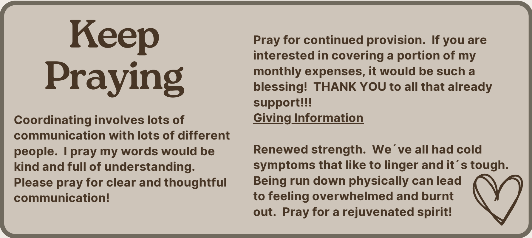 In the middle of disappointment, He is close by. He strengthens us and encourages us to abide in Him. He also reminds us to look at the big picture and the truth is that Porfi and I are extremely blessed. God continues to abundantly provide. He has provided family, friends, a safe place to live and so much more.